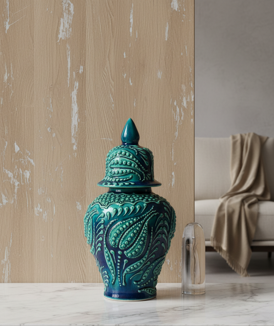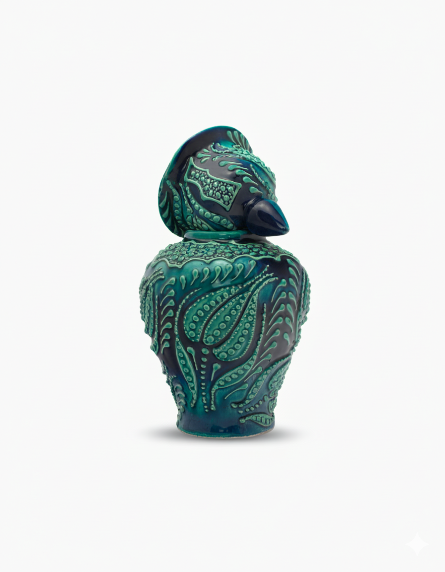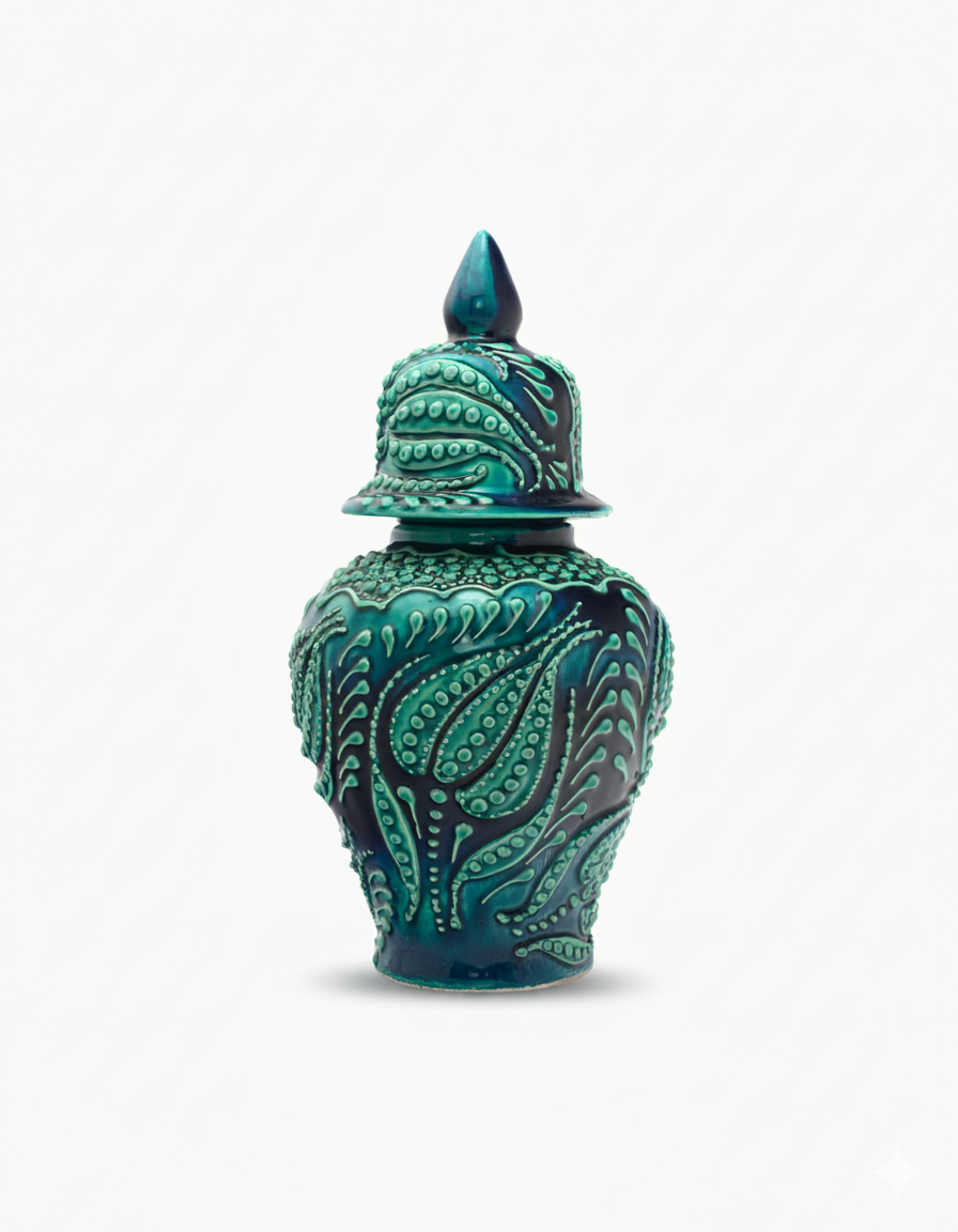 Geleneksel Türk çini sanatının zarif detaylarını yansıtan 25 cm el yapımı çini kavanoz, kabartma lale motifleriyle tasarlanmıştır. Turkuaz zemin üzerine işlenen kabartmalar, güçlü bir kontrast oluşturarak dekorasyona göz alıcı bir şıklık katıyor.Salon, oturma odası, ofis ya da koleksiyon köşelerinde estetik bir obje olarak kullanılabilir. Aynı zamanda sanatı ve zarafeti bir arada sunan, sevdiklerinize anlamlı bir hediye seçeneği olarak da öne çıkar.