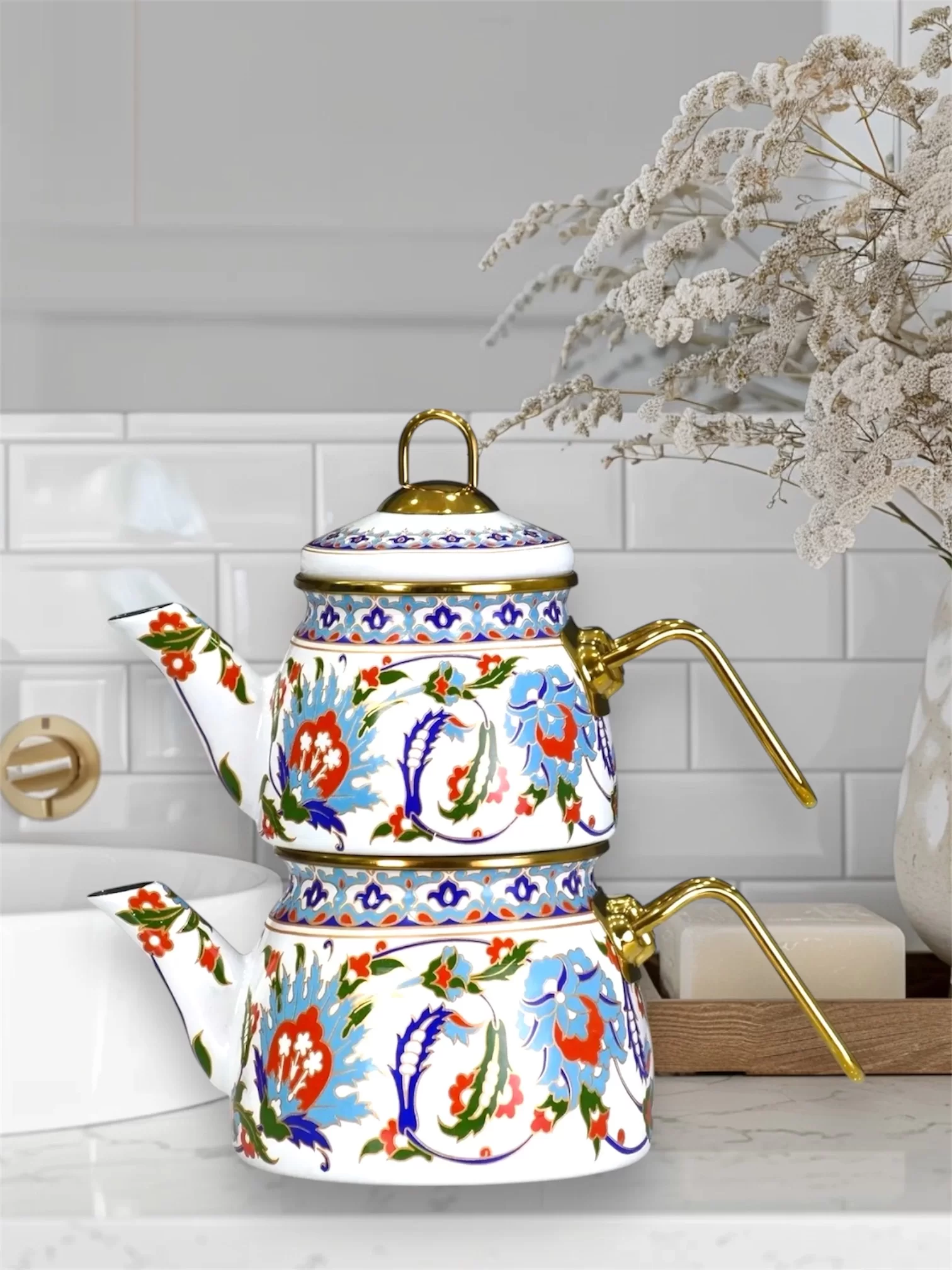 Set İçeriği: Dekorlu Çaydanlık Alt 1 Adet, Dekorlu Çaydanlık Üst 1 Adet, Dekorlu Tepeli Emaye Çaydanlık Kapağı 1 Adet *Bulaşık Makinesinde Yıkanabilir, kolay temizlenir, tum ocak tipleri için uygundur. *Ayarlanabilir Kilitli kapak sistemi mevcuttur. *Buzdolabı ve dondurucu kullanımına uygundur. *Emaye Ürünlerimiz PFOA içermeyip antibakteriyel olduğundan sağlıklıdır. *Kapasite: Üst Demlik Kapasite: 1.1 Lt, Alt Demlik Kapasite: 2.1 Lt. *Dış kaplama desenli emaye, iç kaplama düz renk emayedir. *Desenlerimiz pişirme tekniği ile uygulandığından Ürünümüz rengini yıllarca korur. *Üretim Yeri: Türkiye *Ürünlerimiz el yapımı olduğu için, yüzeylerinde üretim tekniğinden kaynaklanan hafif farklar, noktacıklar ve minik baloncuklar bulunabilir bu durum, ürünlerin özgünlüğünü yansıtır ve bir üretim hatası değildir.